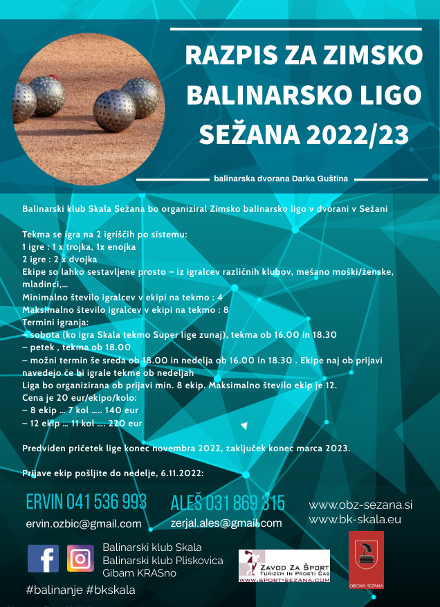 Balinarski klub Skala Sežana bo organiziral Zimsko balinarsko ligo v dvorani v Sežani.