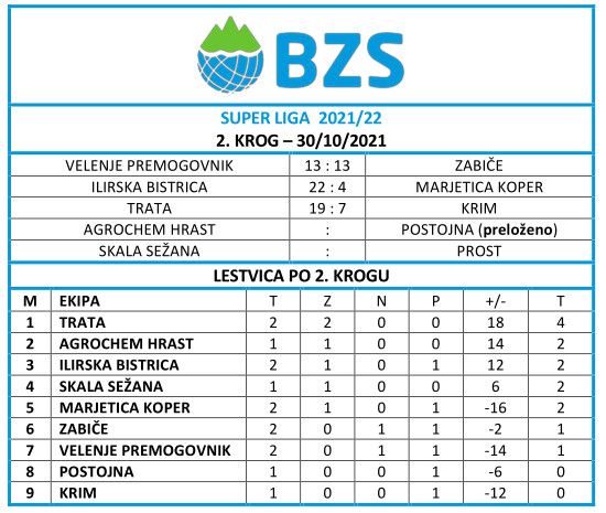 V derbiju kroga v Sežani je Skala uspela streti odpor močne Ilirske Bistrice. V hitrostnem zbijanju sta blestela domačin Gašper Povh in gostujoči adut Martin Zdauc s po 45 zadetki, ključne točke za Kraševce pa je z zmago proti Simonu Požarju z 22:21 prispeval Matija Povh. Bistričani se v končnici niso uspeli približati, tako da bodo prve točke v sezoni lovili naslednjo soboto proti Marjetici Koper, ki je bila na domačem igrišču boljša od Zabič.
