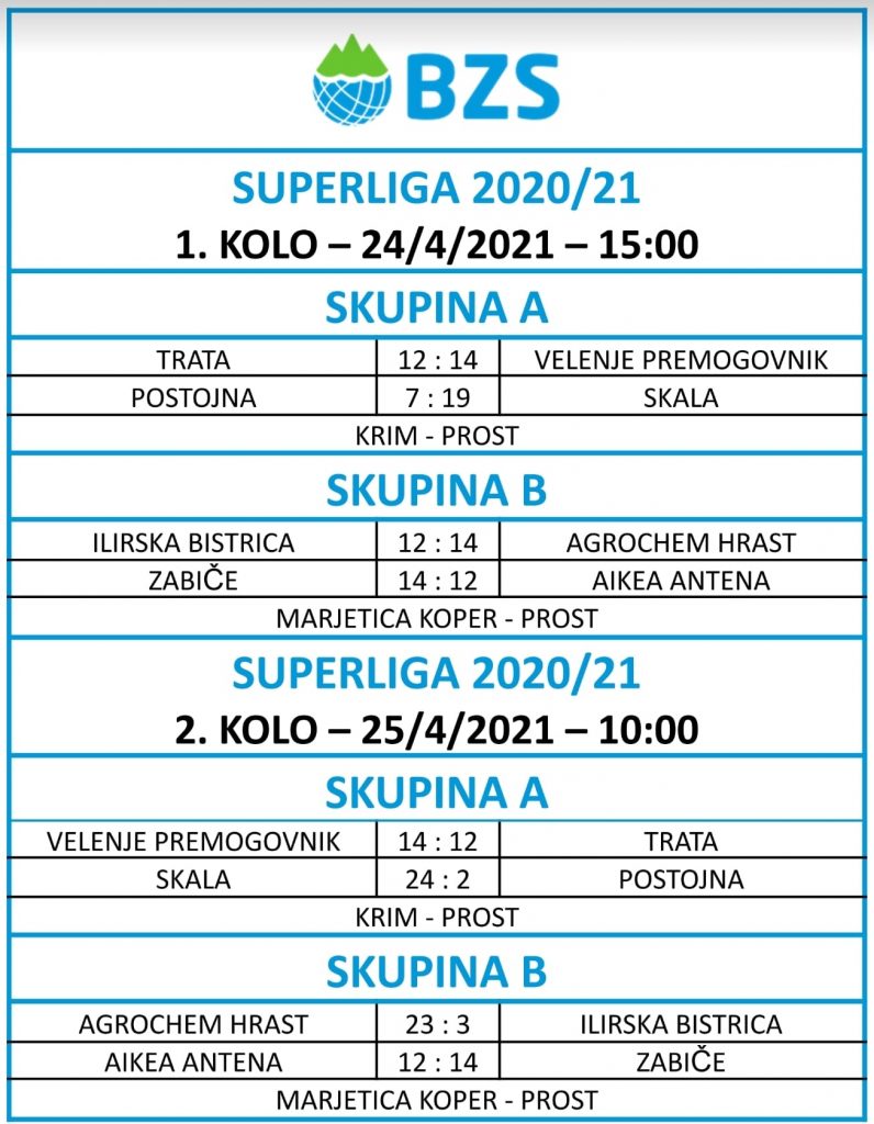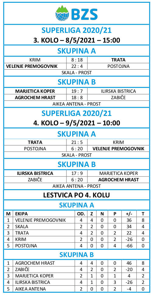 Skupina A: Velenje Premogovnik – Trata 14:12 STATISTIKA, Skala – Postojna 24:2 STATISTIKA, Krim prost. Lestvica: Skala in Velenje Premogovnik 4, Trata, Postojna in Krim (-2) 0 točk.